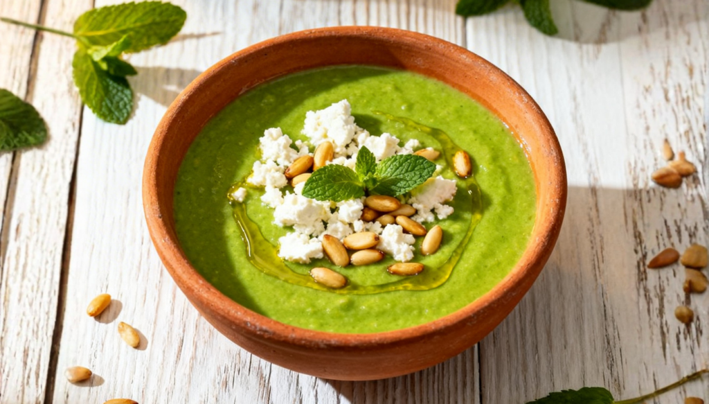 Crema de pèsols del Maresme amb mató, pinyons, pera caramel·litzada i oli de menta